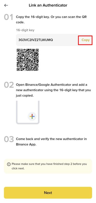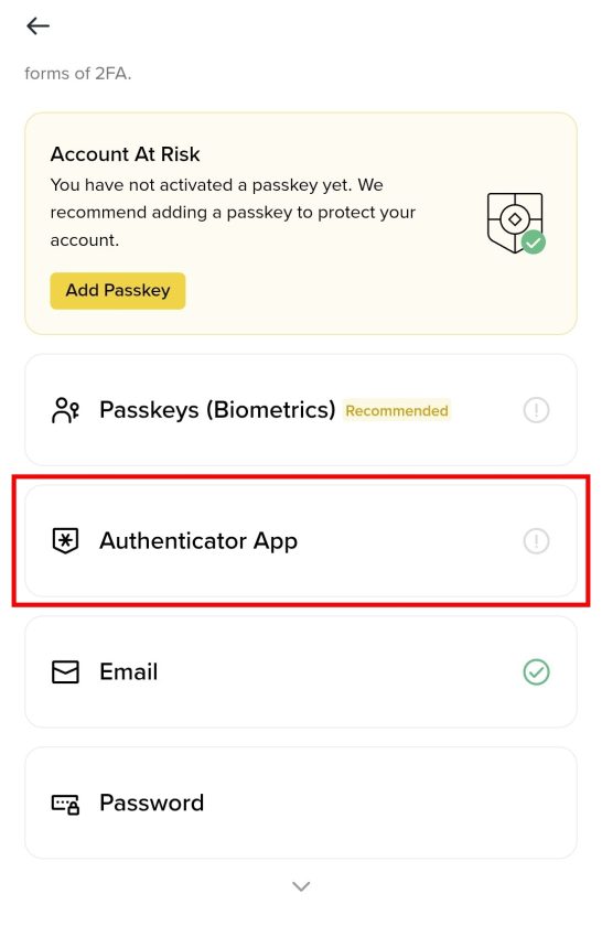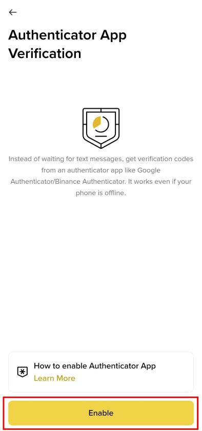 Open Binance and tap your profile icon (top-left). From your username, navigate to Security. Then, select Authenticator App and tap on Enable.