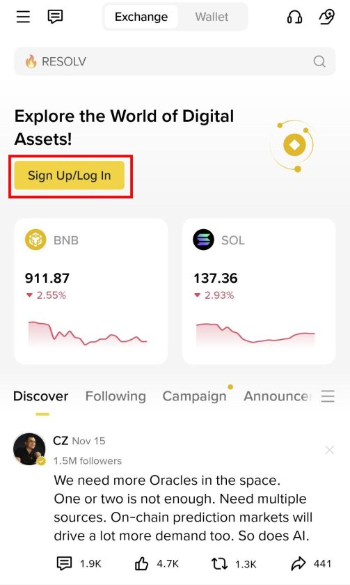 Start by opening the Binance application on your mobile phone. You’ll be taken to homescreen, tap on the Login / Sign Up.