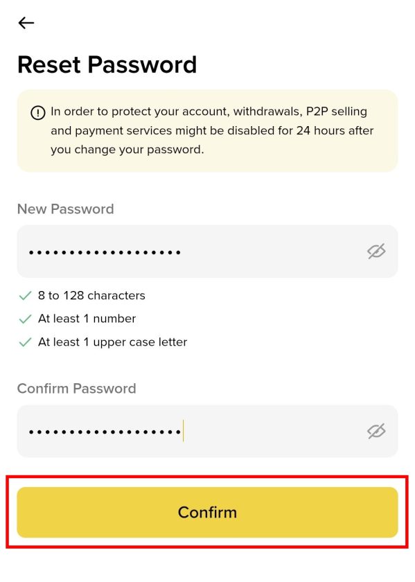 Once you enter the correct code, Binance will take you to the password reset page automatically.