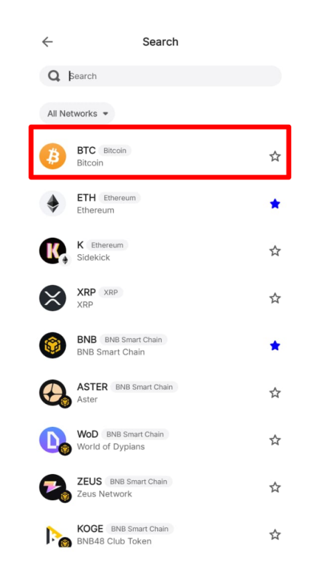 Once you’re on the home screen, you will see a list of available cryptocurrencies. You can either tap on a crypto listed on the homepage or use the search icon to find the specific cryptocurrency you want to purchase. For this example, we will use Bitcoin (BTC).