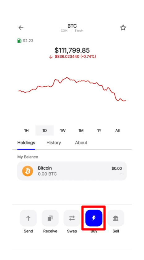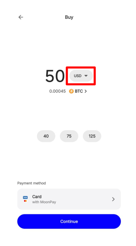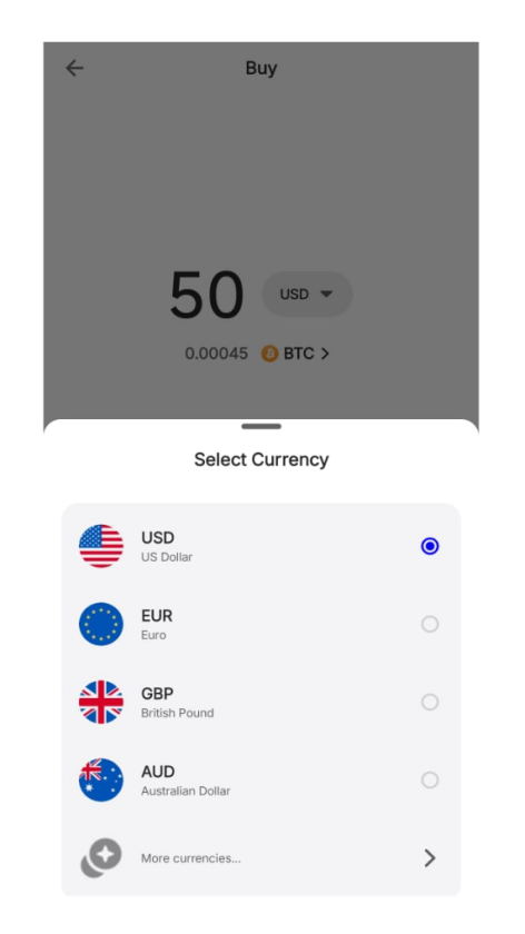 Tap on BTC or your chosen crypto. Here, you’ll see the data about Bitcoin. Once you tap on Buy, the purchasing interface will appear. You can select your preferred currency by choosing from a variety of supported currencies. Enter the amount of currency you wish to spend. The wallet will automatically display the equivalent number of coins you will receive.
