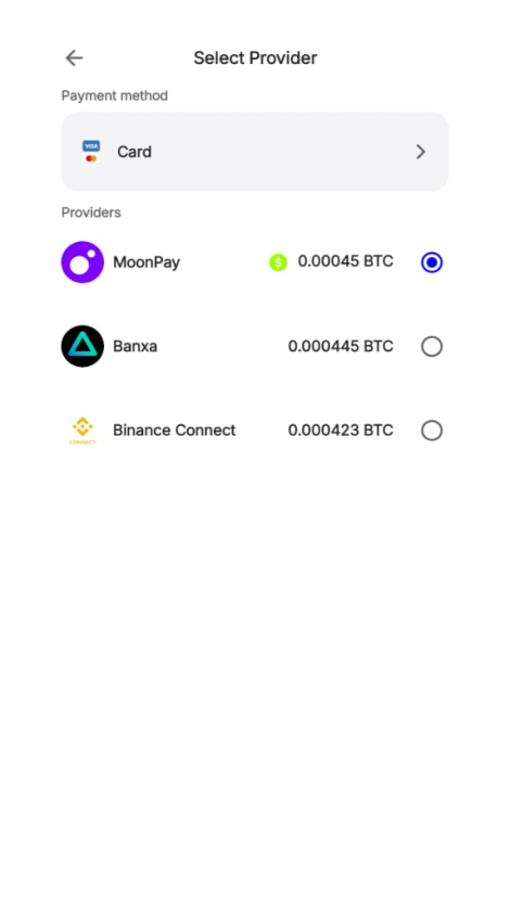 Tap on the Payment Method option at the top. Then select Credit Card as your payment choice. This wallet integrates with providers like MoonPay, which securely handles crypto purchases. Tap on preferred providers to continue.